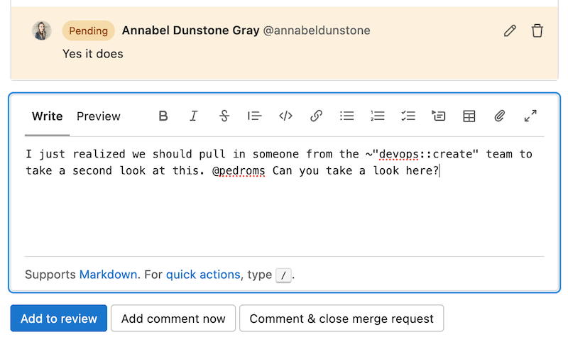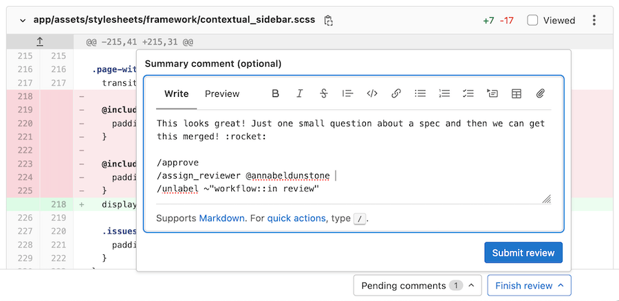 6. When your review is complete, you can submit the review. Your comments are now visible, and any quick actions included in your comments are performed.